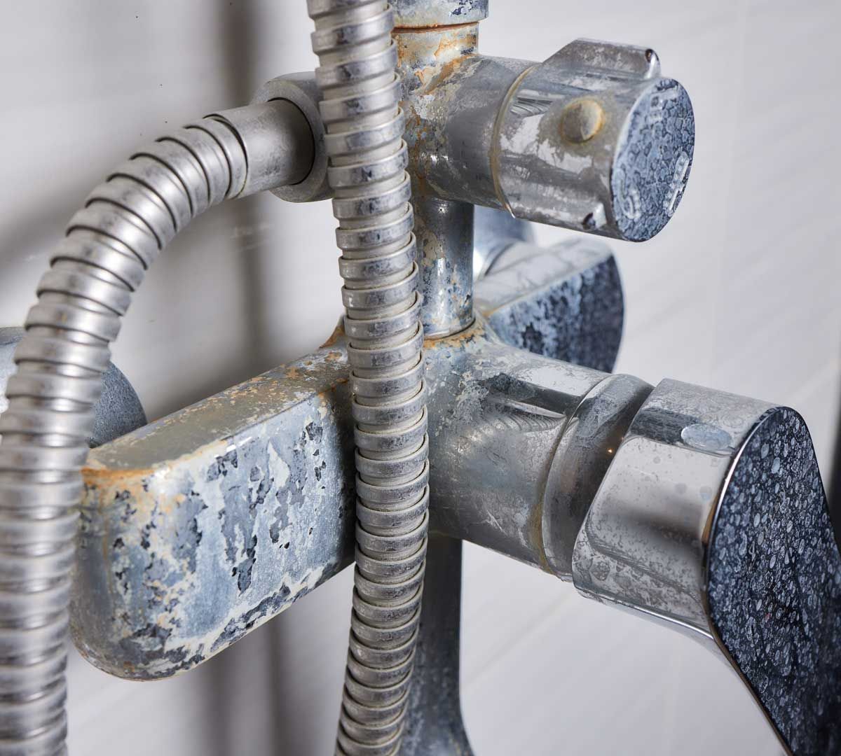 Mineral deposits accumulate inside plumbing, narrowing pipe diameter and reducing water pressure. Faucets and showerheads often clog or corrode faster.
